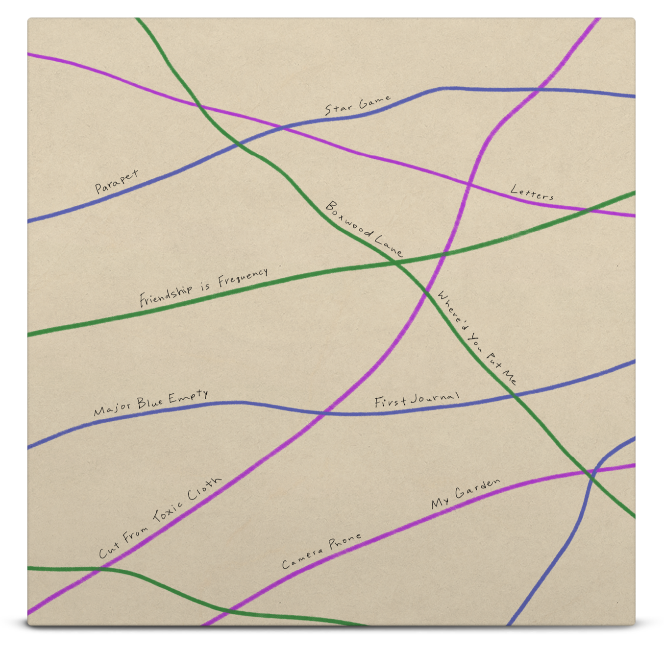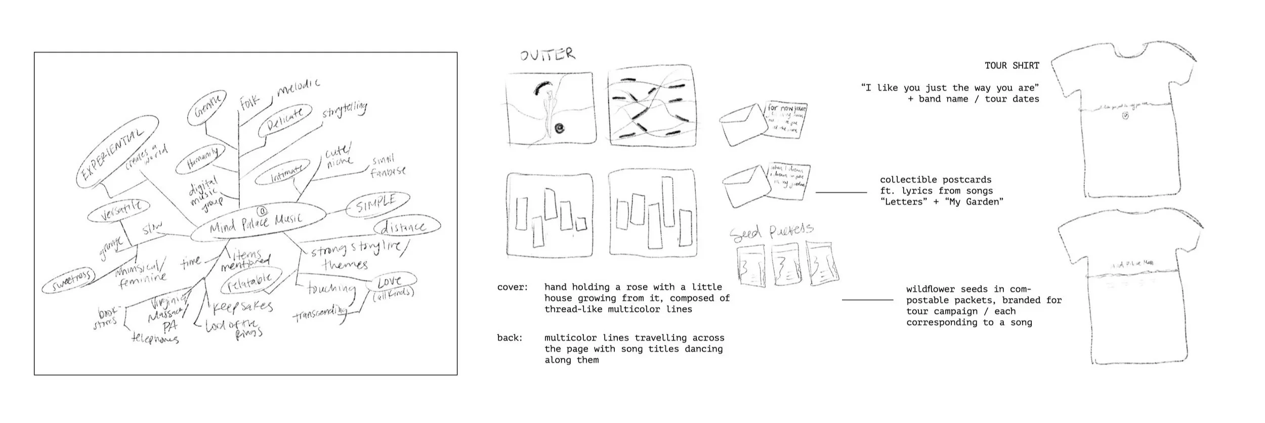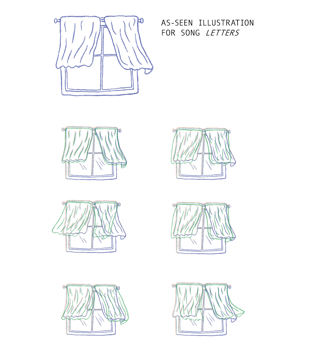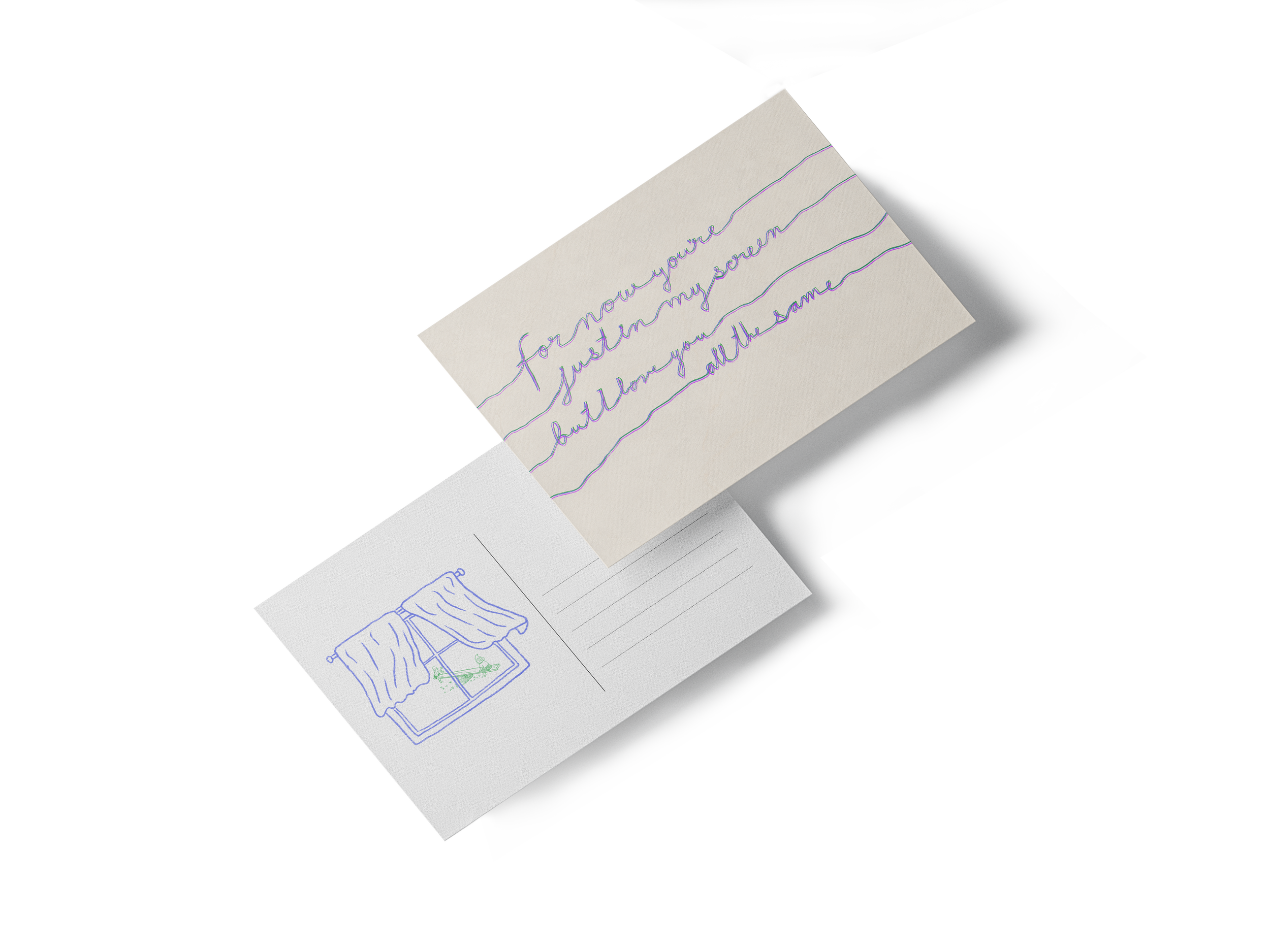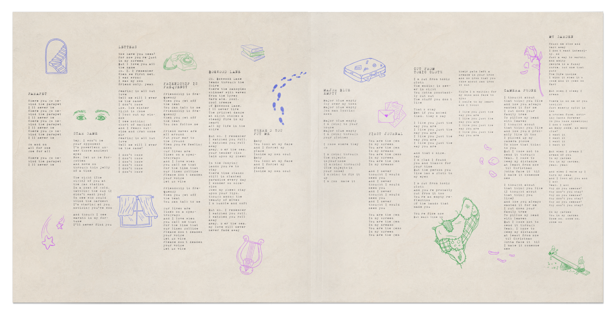 For a piece so tenderly written + played almost as if the band was in your living room, the visual identity of the album should match that sense of human intimacy + storytelling. Interacting with the marketing materials for this album should feel like just as special of an experience as listening to the music is, so the vinyl package is filled with little goodies for the listener to discover – from bespoke stationery sets to micro-illustrations about the songs.